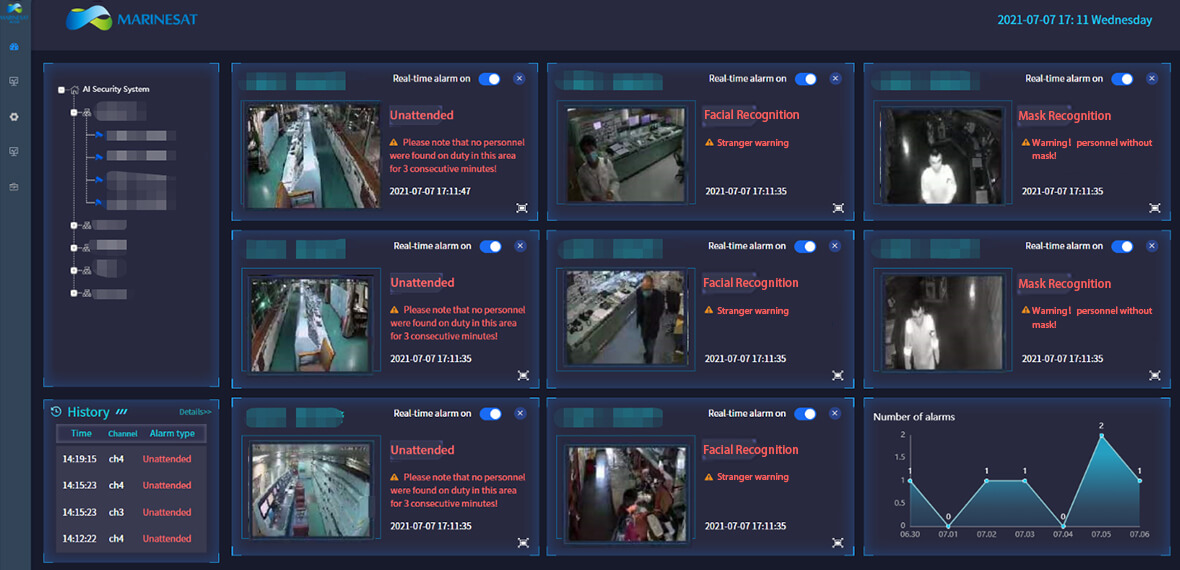 Βασισμένη στο σύστημα απομακρυσμένης παρακολούθησης βίντεο, η Marinesat ανέπτυξε τη νέα γενιά συστήματος διαχείρισης πλοίων AI για να προσφέρει μεγάλη βοήθεια σε θέματα διαχείρισης πλοίων, ασφάλειας εργασίας του πληρώματος και ανίχνευσης κατά της πειρατείας μέσω αναγνώρισης προσώπου και ανάλυσης συμπεριφοράς.